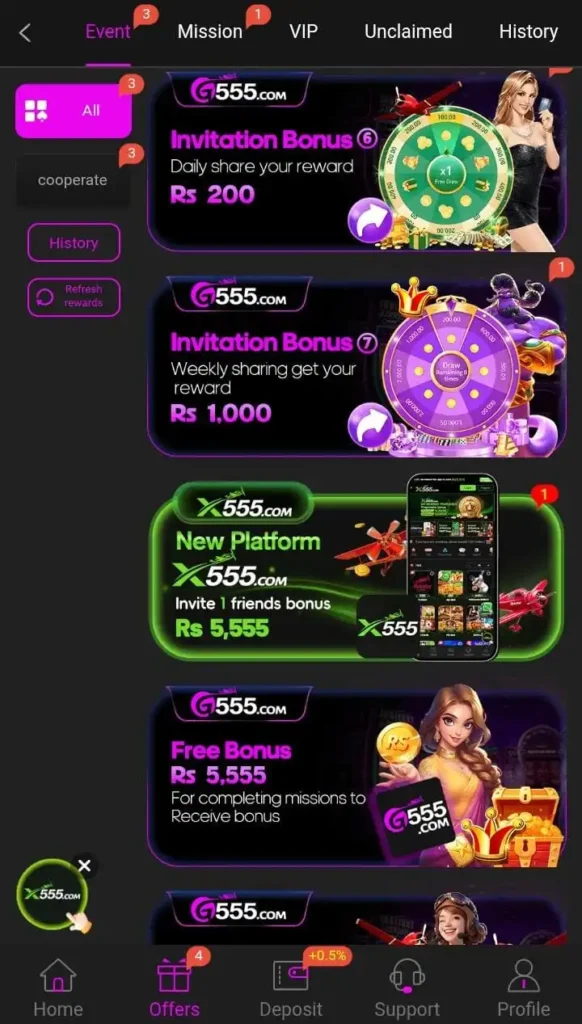 G555 Game Download app also provides different bonuses so users can start their journey even without any deposit. They offer different bonuses like a sign-up bonus, login bonus, daily cashback, VIP bonuses, and many more that are actively given to all users. This app functions and can be downloaded on both Android and iOS devices.
